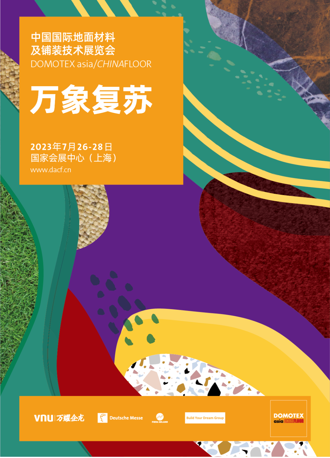 DOMOTEX asia/CHINAFLOOR全新視覺形象“萬象復蘇”,是由全球地毯行業極具影響力的媒體《HALI》雜志創作設計。充滿生機的絢爛色彩,象征著行業復蘇,欣欣向榮的美好前景;配以各類材質紋理相互融合拼接,契合了當下行業互融互通的發展趨勢